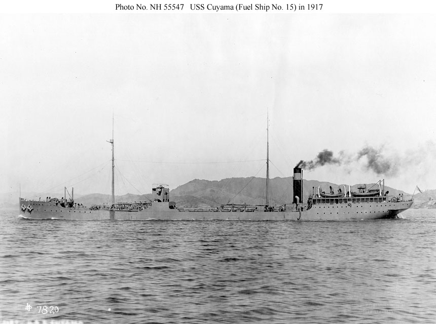 USS Cuyama (Fuel Ship No. 13) Near the Mare Island Navy Yard circa late March 1917, probably on trials. Her armament of 4-5"/50 guns has not yet been installed. Photo No. Unknown Source: U.S. Naval History and Heritage Command. |
