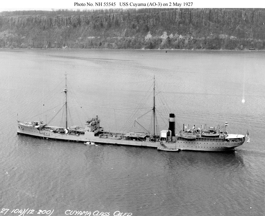 USS Cuyama (AO-3) Photographed on 2 May 1927. Note the absence of platforms for two 3-inch AA guns amidships that were fitted in the three later ships of this class. Her forward fire control position has been removed. Photo No. NH 55545 Source: U.S. Naval History and Heritage Command. |
