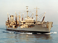 Rigged for fueling to port, date unknown. Note the armament of 4-3"50 guns and the refueling goalpost aft.