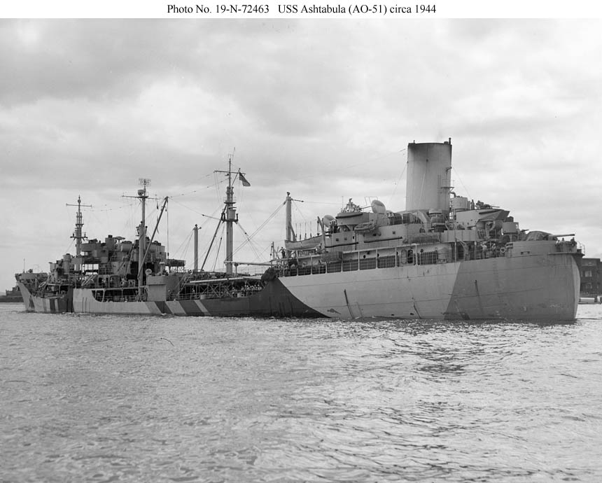 Underway on 13 February 1959 after refueling USS Tarawa (CVS-40). The aft refueling stations on both sides have been strengthened and transformed into a large goalpost mast, an enhancement that was also applied to other Navy oilers in the late 1950s and early 1960s. Her forward 40mm gun position is empty.