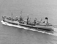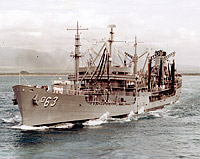 Underway circa the 1970s as a civilian-manned MSTS replenishment tanker. Note the reinforced refueling stations aft.