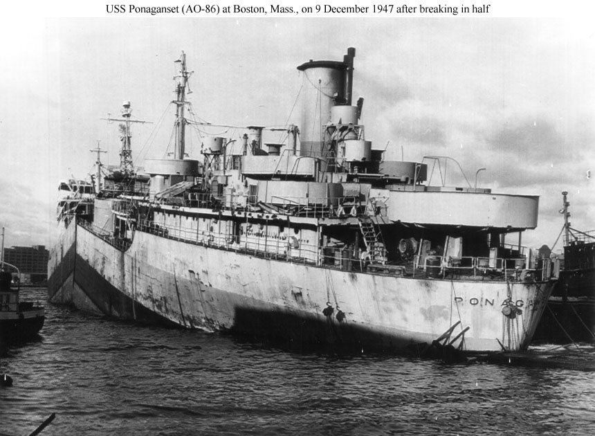 Ponaganset was one of 24 tankers that the Navy reacquired in late 1947 to bring fuel oil for the fleet from the Persian Gulf. Fractures like this had been a problem since late 1942 in war-built welded ships, particularly in Liberty ships and T-2 tankers. Ponaganset was replaced in the Navy's reactivation plan by Mission Santa Ana (AO-137).