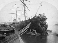 In port, showing damage to her bow received when she rammed an