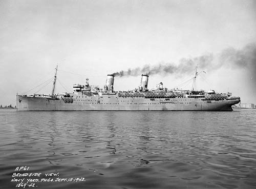 FY 1942. In 1925 the Italian Lloyd Sabaudo Line (one of three firms that were combined in 1932 to create the Italian Line) took delivery from a British shipbuilder of a new ship, CONTE BIANCAMANO, for its passenger line between Genoa and Naples, Italy, and New York. Three years later it took delivery of a practically identical ship built in an Italian yard, CONTE GRANDE, for the same service. The new Italian Line transferred both ships to South American service in 1932. The measurements given here for this class are for the British-built AP-54. The limiting displacement of the Italian-built ship was 25,000 tons, her hull dimensions were 651.8' oa, 625.0' wl x 78.1' e x 27.5' lim., and her speed was 19.5 knots. (The most significant difference was the increased beam, which gave the later ship a better stability margin after wartime modifications were added.) In 1945 the troop capacities of the two near sisters were 6,104 for AP-54 and 6,920 for AP-61.