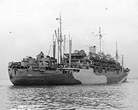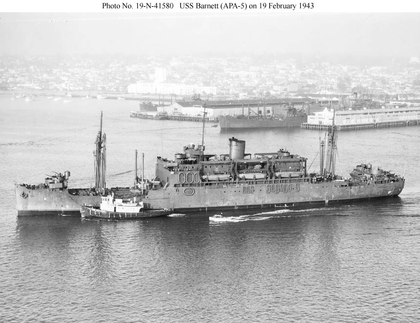 The four double boat davits fitted on each side in late 1941 have been replaced by three triple Welin davits on each side. The 5"/51 gun aft has been removed and two 40mm twin mounts have been fitted, one forward and one aft. The nearest ship in the background is probably Alcyone (AKA-7).