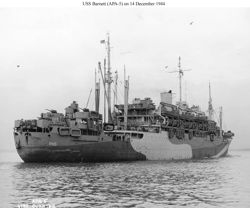 The ship has received additional modifications, most notably four new boat davits on each side, each serving two landing craft. Note her single 5"/51 gun and two 3"/50 guns aft, all with splinter protection.