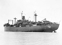 This ship and two other later Western Pipe hulls (APA-92, 93, and 96) had the forward pair of kingposts connected at the top by a light crossbar. During conversion an additional pair of short kingposts was installed just forward of the bridge.