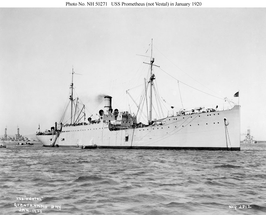 Shown circa the mid- or late 1920s with an Omaha (CL-4) class light cruiser in the background. Vestal supported cruisers of this class for many years.