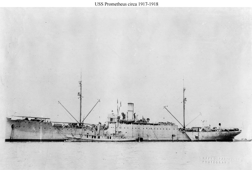 The four rectangular openings at the after end of her amidships superstructure on the starboard side (a feature not in Prometheus) are partly open and the row of rectangular openings in the deckhouse above them are shielded by awnings. The masts and smokestacks of an Omaha class light cruiser are barely visible behind her.