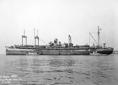 On 16 Jul 41 CNO directed the procurement of critical repair equipment for the conversion of one C3 type ship to a repair ship (AR). On 14 Jul 41 the Auxiliary Vessels Board approved the selection of DELTA for this conversion. On 13 Oct 41 CNO directed that, in view of her planned conversion to another type of auxiliary vessel, DELTA not be equipped for assignment to a Combat Loaded Transport Division (i.e. that she not be fitted as an attack cargo ship). On 2 Mar 42 BuShips selected Cramp SB as the conversion yard, and the conversion contract was awarded on 1 Jun 42. George G. Sharp, Inc., was designated the design agent. DELTA continued to serve as a cargo ship until finally arriving at Cramp's on 8 Jul 42 to begin conversion to a repair ship (AR-9). In early March 1942 she had received a temporary armament as an AK of 1-5"/51 and 4-3"/23 AA. On 3 Jun 42 VCNO specified the structural changes as follows: "New upper deck, new flying bridge and bridge deck extensions, new first and third platforms in #1 hold, new third platform in #2 hold, new third platform in #4 hold, new second and third platforms in #5 hold and new watertight bulkheads as shown. Raising king posts at frames 45 and 71, cutting down king posts at frames 55 and 126, removing king posts at frame 151 and installing one new king post at frame 178 on center line."