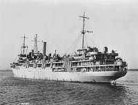 Her four 3"/23 guns, visible fore and aft, were installed at the end of September 1941. They were replaced by 3"/50 guns in August 1942. Note what appears to be a tower for searchlights aft of the bridge.