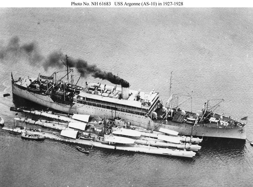 The submarines alongside her are (from outboard to inboard) USS V-2 (SF-5), V-1 (SF-4), and V-3 (SF-6). In 1931 these submarines became respectively USS Bass (SS-164), Barracuda (SS-163), and Bonita (SS-165).