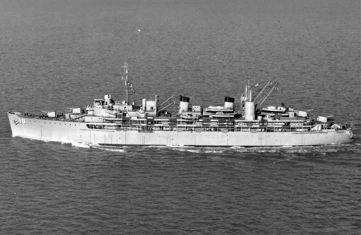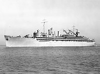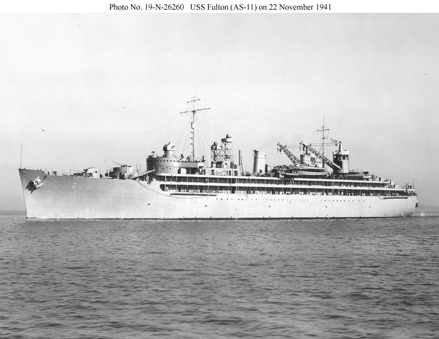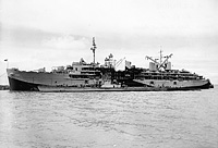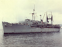 Note the massive kingpost pair with booms in place of the large rotating cranes on the Navy's other large World War II-era tenders.