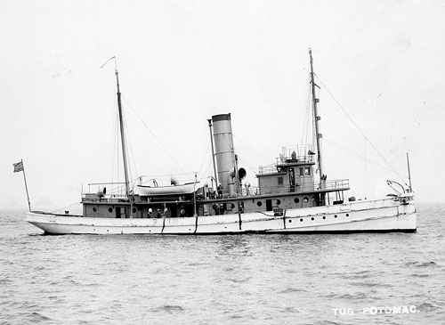 POTOMAC served in the West Indies during the Spanish American War and then served along the East Coast, probably with periods out of commission in 1898-1899 and 1902-1903. She left Newport, R.I. on 28 Jan 14 to rescue vessels icebound off Newfoundland but was herself iced in and abandoned on 14 Feb 14. Salvaged in the late spring, she arrived at the New York Navy Yard on 9 Jun 14. After overhaul and repair, she became a tender in the Atlantic Fleet during 1915, and tender to the Canal Zone submarine squadron in 1916. Late in 1916 she was transferred to the West Indies, where she spent much of her time based at Santo Domingo and in Haiti. POTOMAC was designated AT-50 when the Navy's standard hull classification scheme was implemented on 17 Jul 20. She returned to Norfolk for the last time in May 1922, her 3-pounder guns were removed on 26 Jun 22, and she was stricken and and ordered sold on 31 Jul 22. Sold to a New Orleans firm, she recovered her original name and remained in service until 1981.