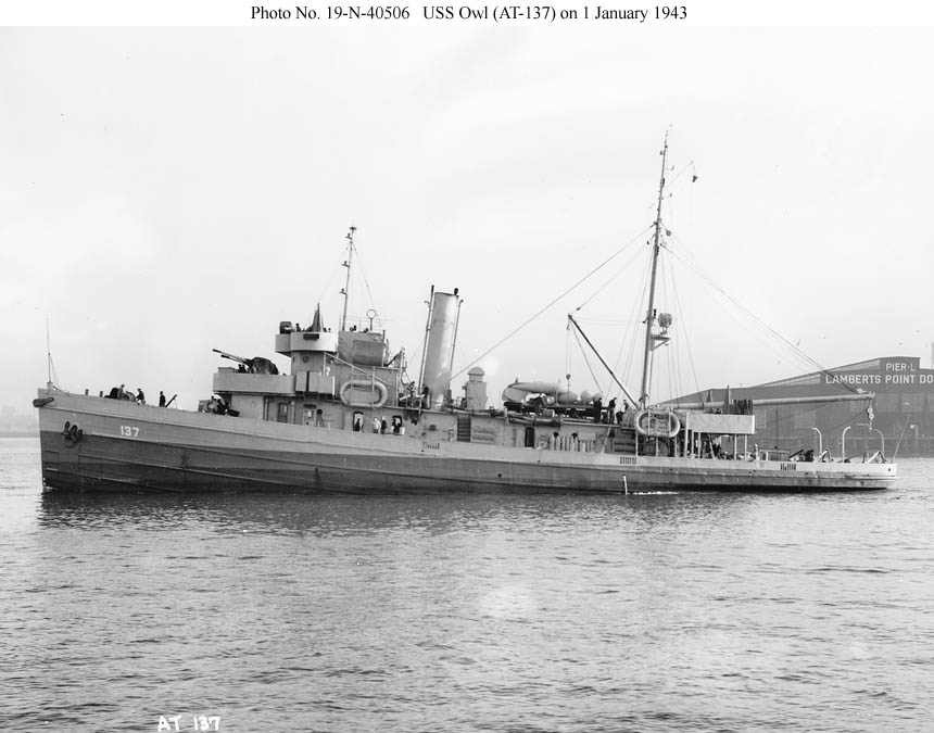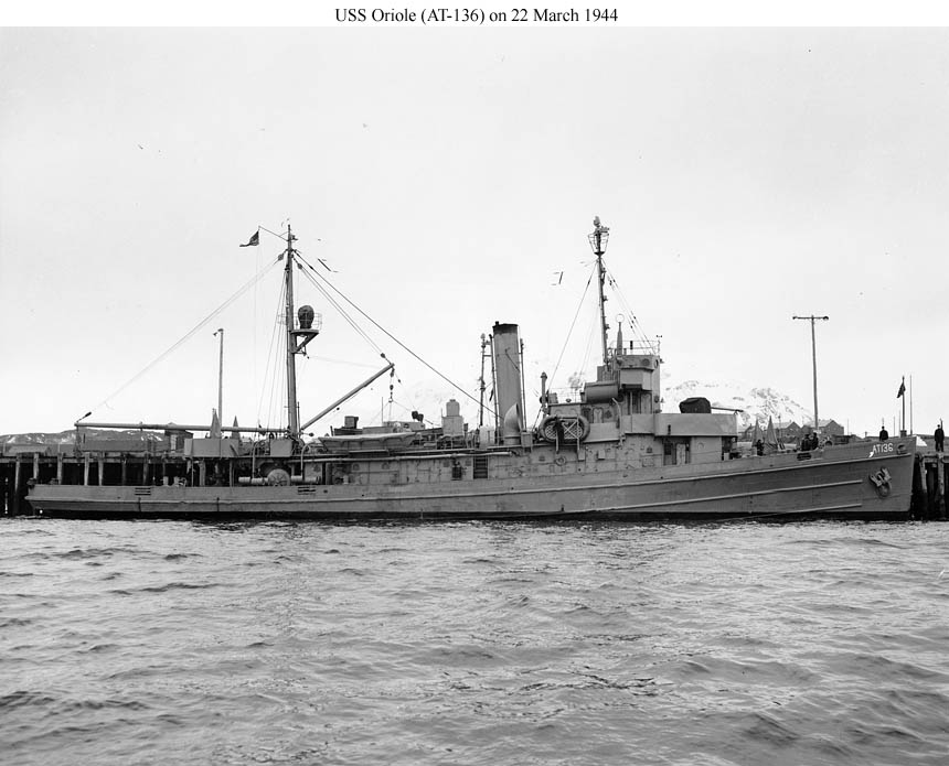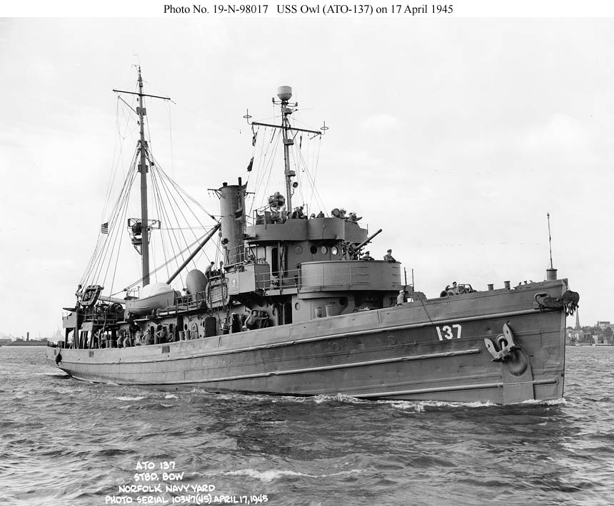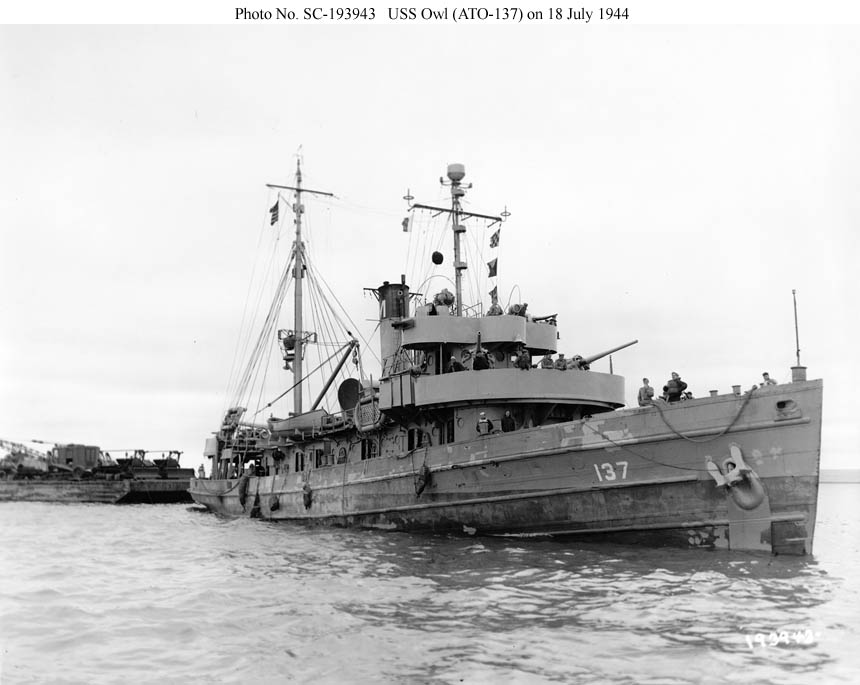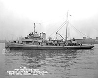 Entering Cherbourg, France, on 18 July 1944 towing two barges with Army Engineer equipment.