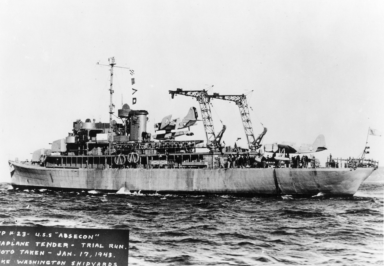 In Puget Sound, Washington, on 14 October 1941 in her original configuration. The class was designed with a large seaplane handling crane, similar to those on the large seaplane tenders, with a clear fantail upon which the aircraft could be serviced. Biscayne (AVP-11) was also completed with this crane and Casco (AVP-12) and Mackinac (AVP-13) were being built with it as of early October 1941.