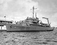 Off the San Francisco Naval Shipyard on 19 December 1961 showing the ship as modified for transfer to Ethiopia. Additional superstructure has been added aft, and her armament has been reduced to a single 5"/38 gun mount forward.