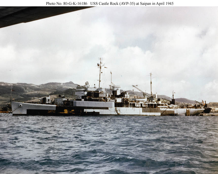 In Tanapag Harbor, Saipan, in April 1945, photographed from a PBM seaplane moored nearby. A large seaplane tender (AV) is behind the AVP's stern. Castle Rock is wearing weathered Measure 32, Design 2ax camouflage.