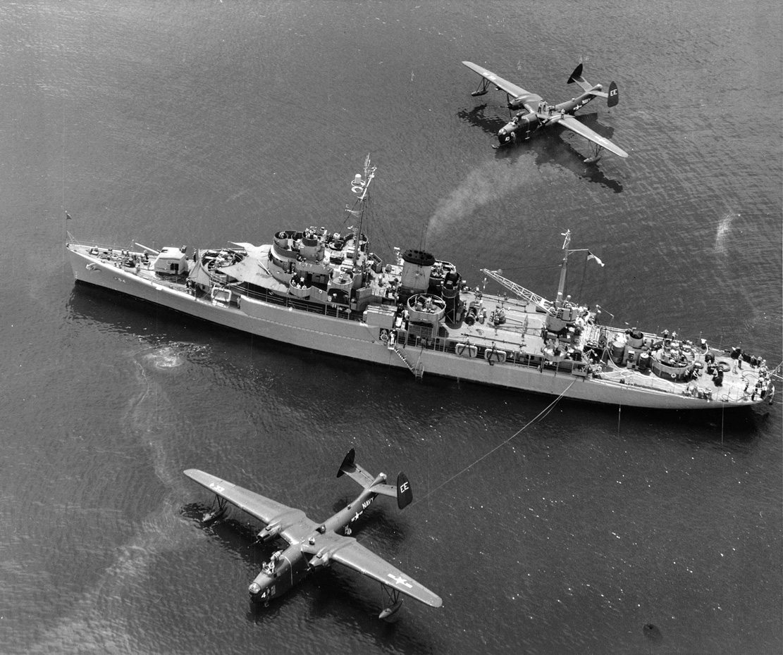 Tending two Martin PBM Mariner seaplanes soon after World War II. The second quadruple 40mm gun mount, on the fantail, was added in around 1948. Six other ships (AVP 38-41, 53, and 55) were so modified between around 1947 and 1951.