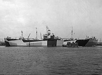 Departing her builder's yard at New Orleans, Louisiana, as a merchant ship on 15 February 1944.