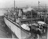 Probably shown arriving on 31 October 1920 under tow at her conversion shipyard in Hoboken, N.J., from her builder's yard at Hog Island, Pa. She grounded in attempting to enter her slip (possibly shown here) and was floated and tied up temporarily to other vessels. She is a standard Hog Island Type B transport (EFC Design 1024) with many items in the after part of the ship, including both goalpost masts, not installed. Photographed by Todd Shipyards Corp., owner of the Hoboken yard.