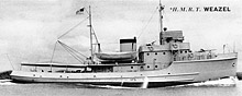 Note the clutter of towing gear on the after decks of these British tugs. USS Plunkett (DD-431) is in the background.