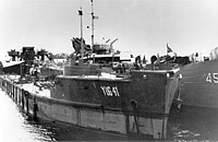 In service at an advance base in the Pacific with an LST alongside, probabley to receive diesel fuel.