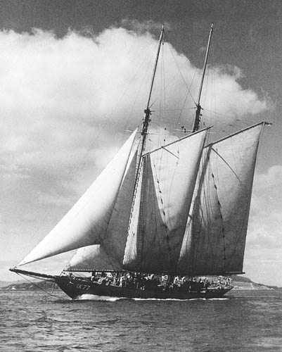 Ex yacht RAMONA, ex OHONKARA. Auxiliary schooner. 90 tons light, 126 tons gross. 109.0' oa, 79.1' wl x 23.5' x 14.3'. Steel hull. 1 Speedway gas engine. |