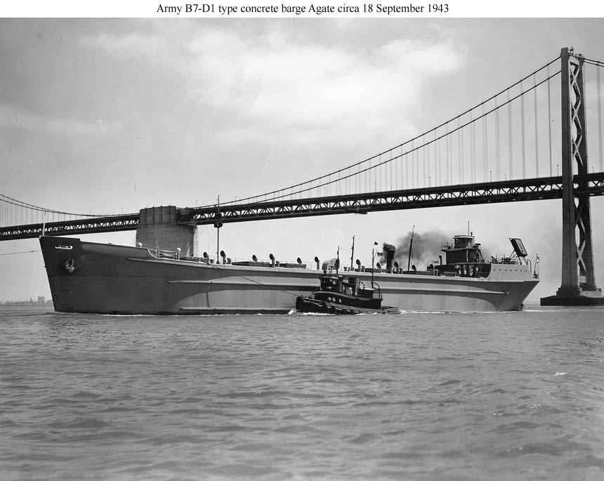 The photo was backstamped 18 September 1943 by the photographer; initial delivery to the Army, perhaps at the builder's yard, had taken place on 24 August 1943. Agate was the first B7-D1 concrete barge to be delivered, one of only two that went to the Army, and the only one of these that did not receive the Navy's stores issue conversion.