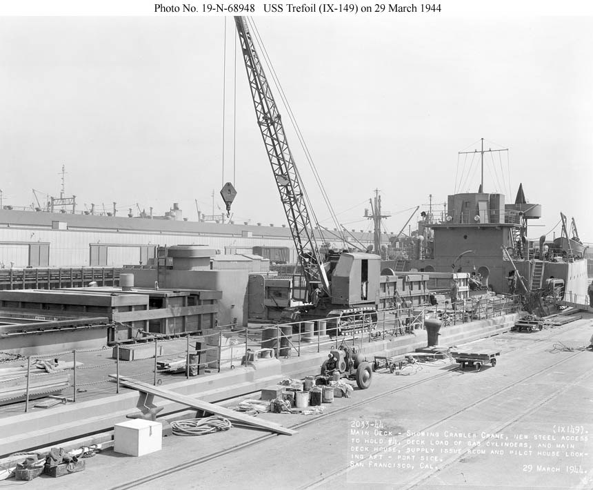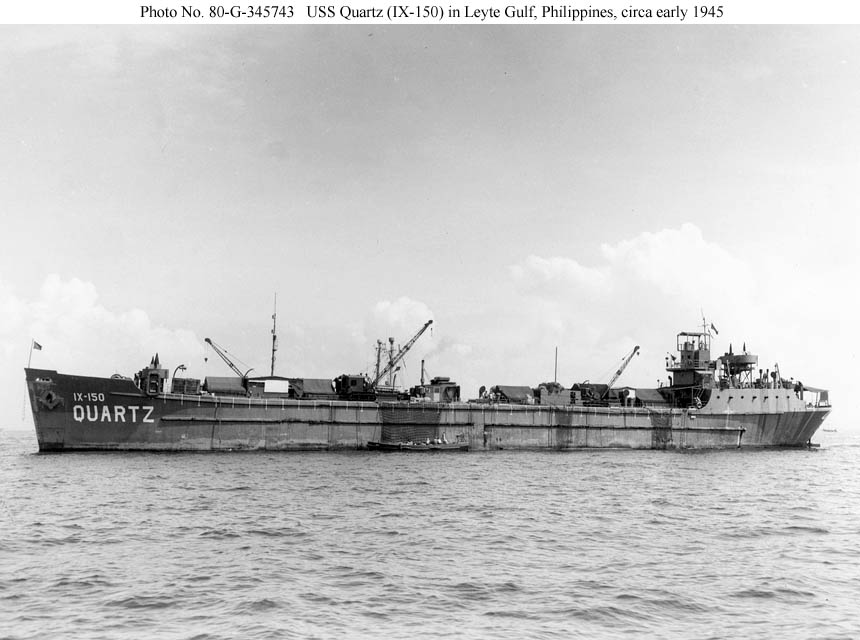 Serving in 1944 or 1945 as a floating warehouse at a mobile supply and repair advance base in the Western Pacific.
