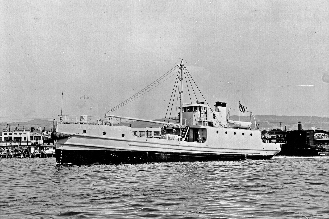 YF-270 departing Pacific Dry Dock & Repair, Oakland, where she had been completed on 19 September 1941.