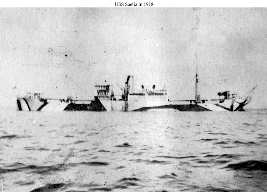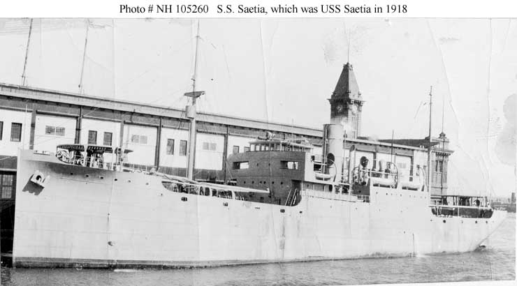Saetia, a 2873 gross ton (6375 tons displacement) freighter, was completed at Wilmington, Delaware, in March 1918 and placed in commission by the Navy on the First of that month as USS Saetia (ID # 2317). After modifications, including the installation of guns, she loaded an Army cargo of quartermaster's supplies and joined a trans-Atlantic convoy at New York. Arriving with the convoy at Brest, France, at the end of March, the ship moved to Rochefort, France, to offload her cargo and returned to Philadelphia, Pennsylvania, in early May. Between May and November Saetia made three similar voyages to France, delivering the first cargo at Quiberon, the second in the Gironde River, and the third at Bordeaux, France. Near the end of the last of these voyages, while approaching the Delaware River en route to Philadelphia on 9 November 1918, Saetia struck a mine, probably laid by the German submarine U-117, in the vicinity of the Fenwick Island Lightship and sank in 20 fathoms of water. The entire crew took to lifeboats and was saved, although 13 men were injured.