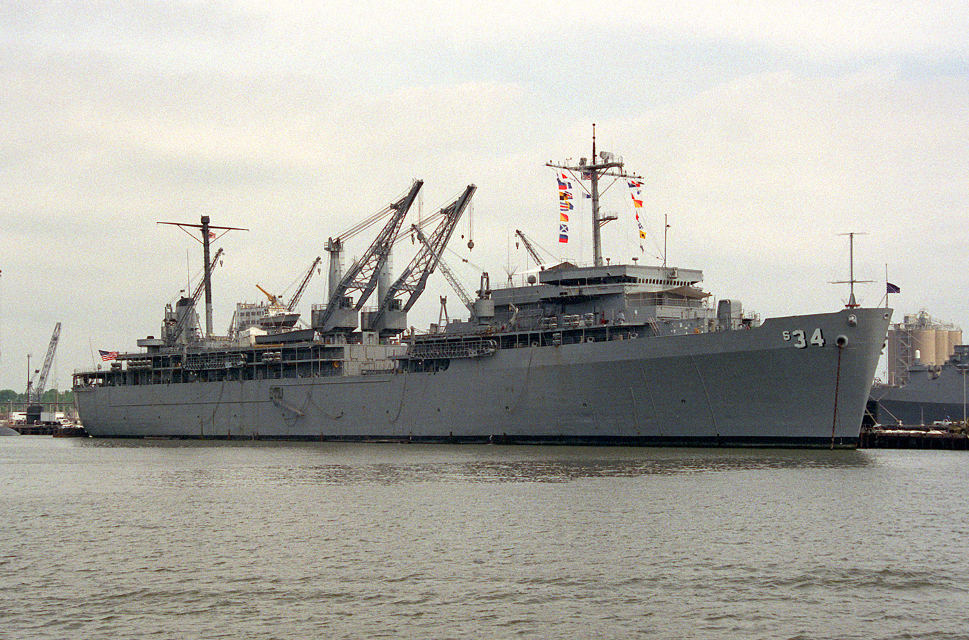 Moored on the north side of one of the D&S piers at Norfolk, Va., on 21 May 1994 with several Los Angeles class nuclear-powered attack submarines moored on the south side of the pier. Photo by Don S. Montgomery, USN (Ret.)