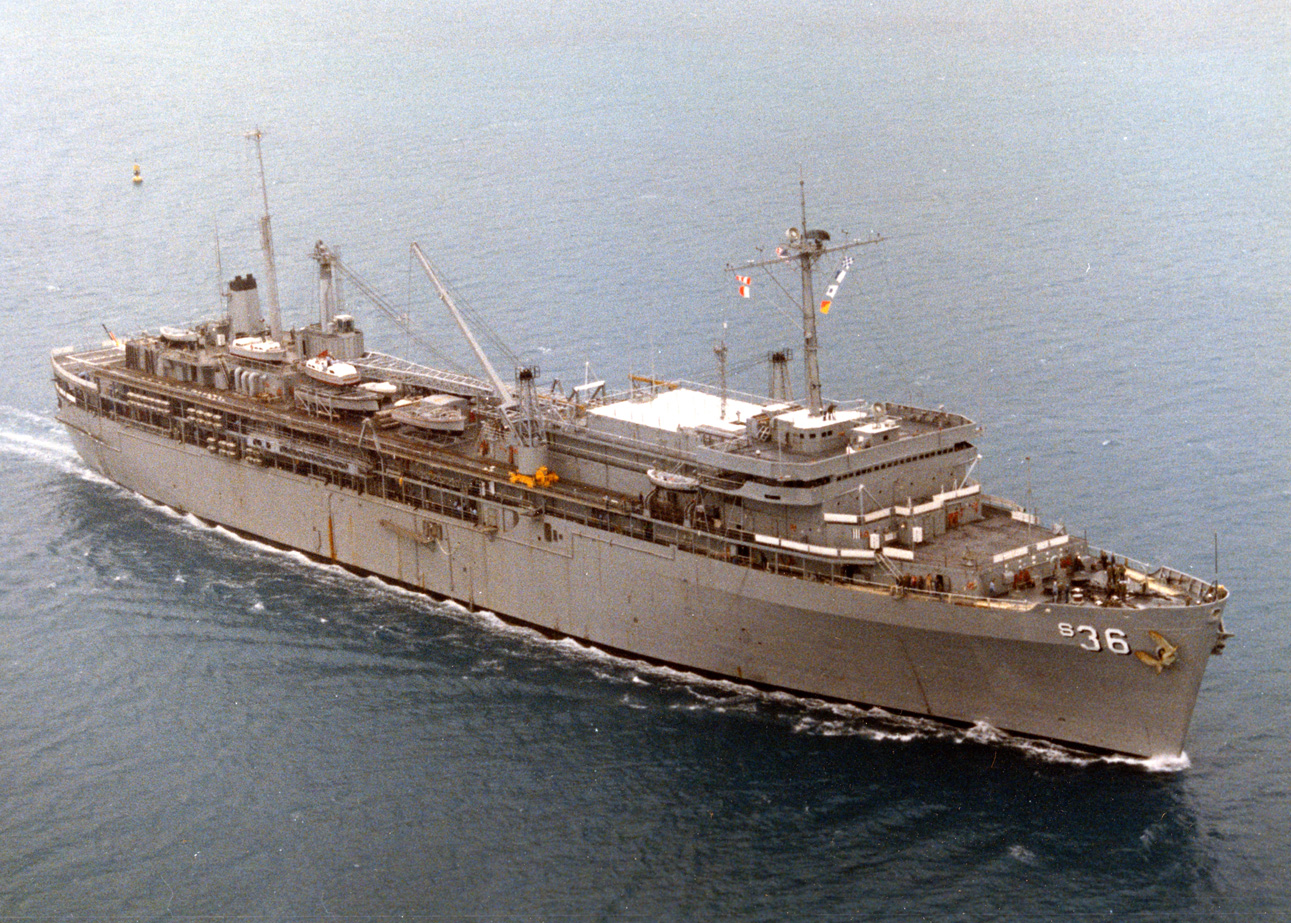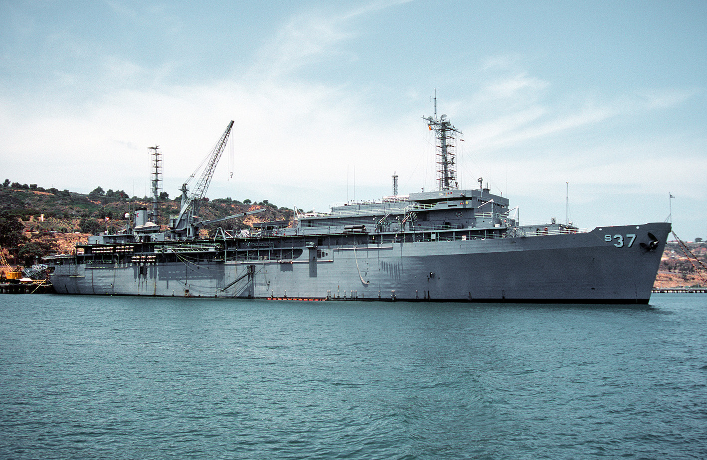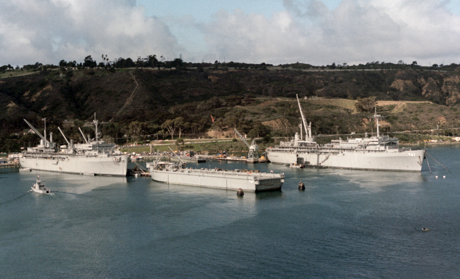 At the Naval Submarine Base, Point Loma, Calif., on 15 April 1987 with numerous nuclear-powered attack submarines tied up alongside the ship and the pier.