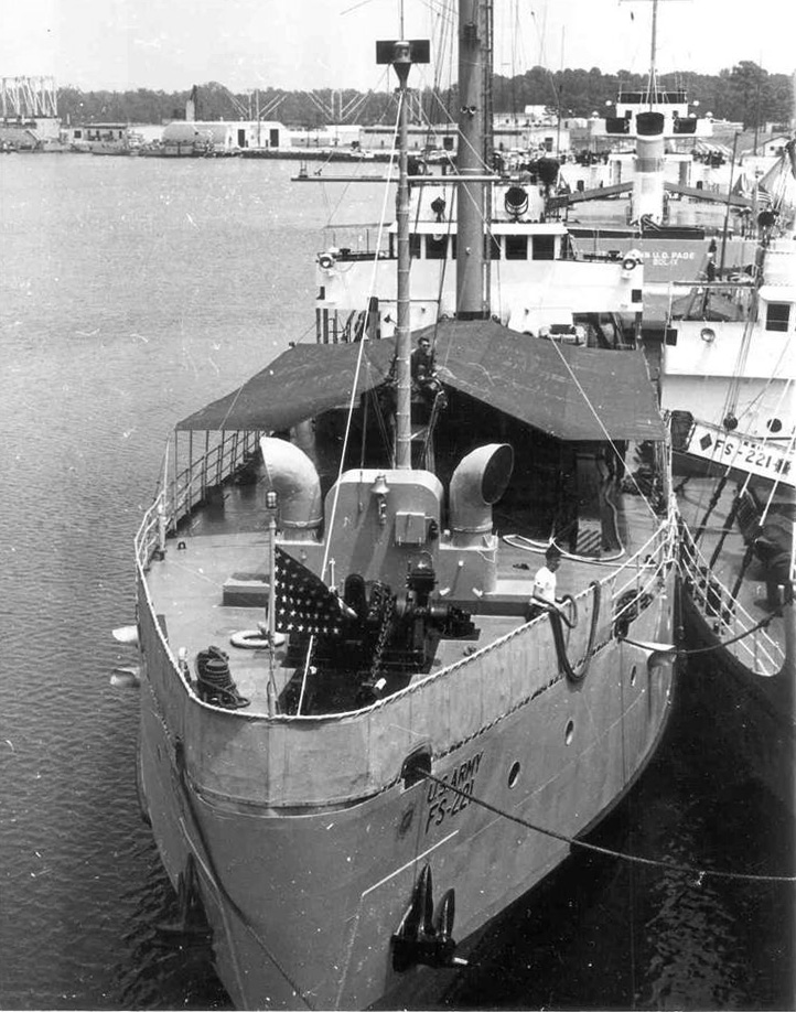 Moored at Fort Eustis, VA., circa early 1961. Although she had an Army name her bow and brow (gangway) show only her FS number. She was acquired by the Navy in July 1968 and converted for service as a torpedo research vessel at Newport, R.I.